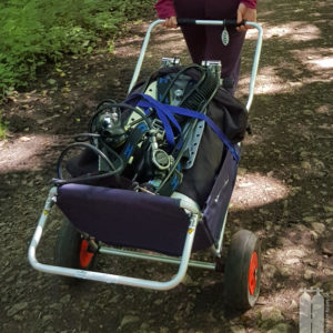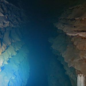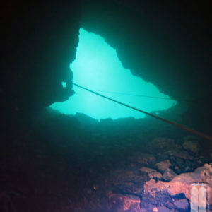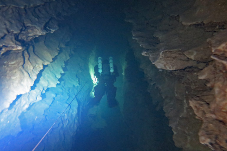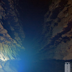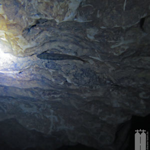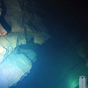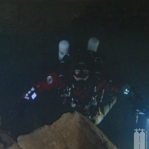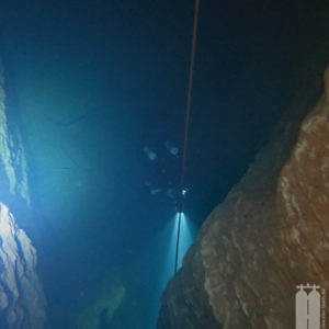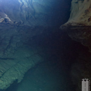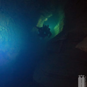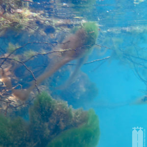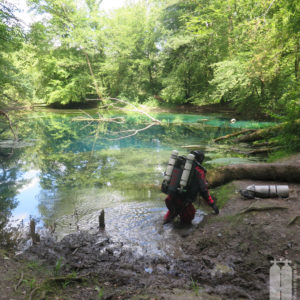 Daraufhin schafften wir mit unserem Trolley die Ausrüstung zum Wasser. Zunächst die Stage, die wir direkt ans Wasser legten, und dann die Hauptgeräte, die wir auf einem Picknicktisch ablegten. Da nichts los war, nahmen wir auch niemandem den Sitzplatz weg. Als wir alle Klamotten da hatten, konnten wir uns in die Trockis schwingen und zum eigentlichen Tauchgang zur Quelle gehen. Mit unseren angelegten Tauchgeräten stiegen wir dann noch die Böschung herunter Richtung Wasser. Peter nahm seine Stage und stiefelte ins Wasser an der Einstiegsstelle, die wir uns vorher ausgeguckt hatten. Er sank sofort bis fast zum Knie im Modder ein. Aber wir mussten dadurch. Also tat es Steffie ihm gleich und irgendwie standen wir nach dem Schlickbereich auf festem Untergrund. Peter verlor dann noch seine Flosse. Durch den aufgewirbelten Lehmboden mussten wir bei Nullsicht suchen. Aber Glück gehabt! Wir haben sie wiedergefunden. Nachdem wir die Primary Tie-Off an einem Baum montiert haben, mussten wir nur noch den Eingang suchen. Den fanden wir aber schnell unterhalb der Böschung . So montierte Peter auch den secondary Tie-Off. Nur noch den Start-Cookie an die Mainline angeheftet, konnte es in die Höhle hineingehen. Mega! Bei toller Sicht tauchten wir ein und die hielt auch an. Wir passierten die 90° Grad-Kurve nach links und folgten dem engen, aber hohen Gang. Nach ca. 150 Penetrationsmetern war jedoch schnell Schluss, denn dort geht es auf 30 m herunter, was nicht der Rede wert wäre, jedoch steht im Höhlenplan, dass das Gestein dort instabil sei. Und ein Risiko wollen wir nicht eingehen. Also machten wir uns auf den Rückweg und schauten uns noch einmal ganz genau um. Und so waren wir nach 40 Minuten wieder draußen.