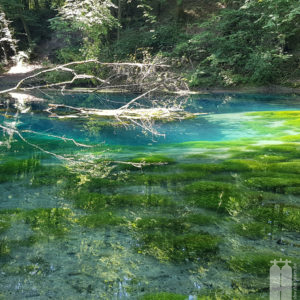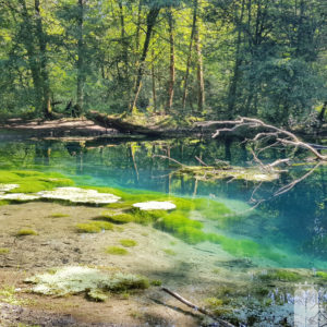 Der Quelltopf war Dank Google Maps leicht zu finden. Wir parkten unser Tauchmobil auf dem gekennzeichneten Parkplatz und legten die weiteren 800 m bis dorthin natürlich zu Fuß zurück. Was dann kam, verdient den Namen Source Bleue zurecht. Das saphirblaue Wasser hatte uns in seinem Bann. Was für ein großartiger Ort!