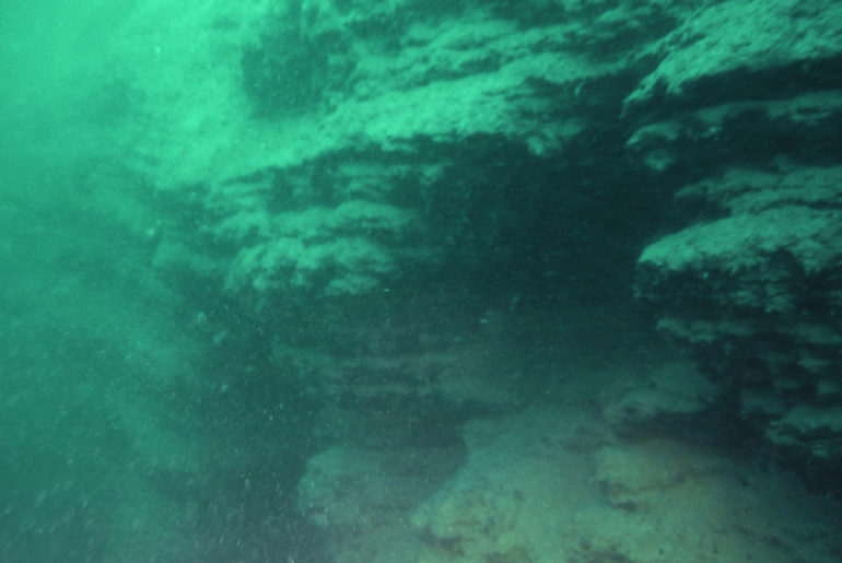 Bocki vom Tauchshop und Füllstation underpressure hat uns abends beim Flaschenfüllen dann den Tipp gegeben auf 7 m abzutauchen und dieser Linie linker Hand dem Ufer zu folgen, bis man in die Steilwand „hineinfällt“. Mit der Angabe „zwischen der 4. und 5. Boje“ kann an Land die bis dahin zu schwimmende Strecke schon einmal abgeschätzt werden. Es sind auch hier wieder gut 10 Minuten.