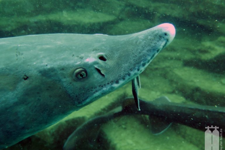 Aber dann ging es endlich los und wir durften alle ins Wasser. Bei mäßiger Sicht tauchten wir zu einer Grotte. Auf dem tolle Formationen bildenden Gestein im Dunkeln dieser hatten sich Schwämme angesiedelt. Anschließend folgten wir dem Seil, was sich durch den See an allen „Hauptattraktionen“ vorbei zieht und schauten uns noch den Panzer an. Die eine Röhre und einen Tannenbaum haben wir auch noch mitgenommen. Wir folgten dem Seil allerdings nicht komplett, sondern saßen die sich mittlerweile angesammelte Dekozeit an dem Felsvorsprung ab, wo sich die Störe und Karpfen sowie viele kleine andere Fische tummeln. An Stören können wir uns nämlich nicht satt sehen. Sie sind so faszinierend. An diesem Tauchspot kommen sie bis an den Taucher heran und knabbern an der Maske, stupsen neugierig oder zupfen auch mal an der Kamera. Toll, den Tieren so nahe zu sein.