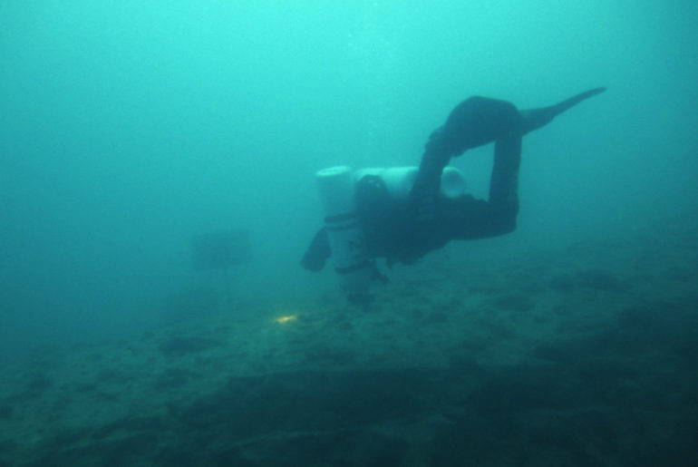 Es ging von E1 Richtung E0. Zunächst haben wir uns die Steilwand hinab von 11 auf 28 m fallen gelassen. Vorbei an der Rührwerkstütze entlang des abfallenden Ufers sind wir ein ganzes Stück Richtung Fischzucht getaucht, um dann umzukehren und die Steilwand wieder hinaufschwebend an E1 den Tauchgang wieder zu beenden. Die Sicht war hier zu unserer Freude viel besser als an so manch anderen Plätzen.