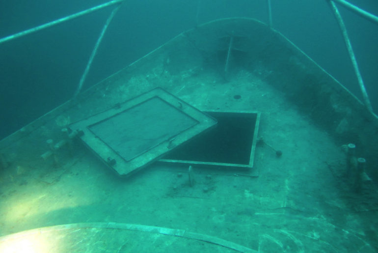 Und siehe da, wir fanden die Segelyacht noch. Die Luken sind mittlerweile, anders als bei unserem letzten Besuch, geöffnet worden, so dass ins Wrack hineingeschaut werden kann. Im Wrack selbst war ganz hervorragende Sicht, so dass die Fotos darin, mit Blitz fotografiert, richtig prima geworden sind.