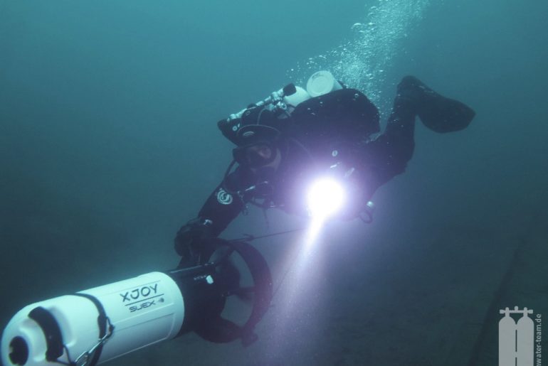 Einen Tag später ließen wir es ruhig angehen und tauchten mit Beate von E2 noch einmal ganz entspannt zur Rüttlerbrücke und dann über die Schütte hinweg in Richtung Rüttlerkeller. Besonders hat uns gefreut, dass Beate so viel Spaß hatte und wir ihren persönlichen Tiefenrekord im Kaltwasser völlig relaxed knacken konnten.