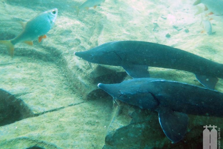 In dem alten Steinbruch findet man verschiedene Objekte, die betrachtet und betaucht werden können. Wir sind der Führungsleine durch den See gefolgt. Zunächst ging es an einer Steilwand entlang, die auf max. 30 m abfällt. Anschließend folgten Grotten, zwei Panzer und andere kleine und große Attraktionen. Zum Schluss haben wir noch die Karpfen und Störe beobachtet, die sich an einer Stelle tummelten. Ein bisschen geärgert haben wir uns darüber, dass einige Taucher in dieses Rudel hineintauchen und die nicht scheuen Tiere anfassen mussten. Sie hätten einfach nur Geduld haben müssen. Die Störe sind von ganz alleine gekommen.