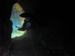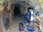 Endlich ging es am nächsten Tag los zum Tauchen. Peter Kubicka nahm uns nach einer kleinen Autofahrt direkt vor der Opalmine in Empfang. Er erklärte uns zunächst einiges zur Historie und zu einigen Sicherheitsregeln, die einzuhalten sind. Die ersten beiden Voraussetzungen haben wir uns von Zuhause mitgebracht: einen Helm und eine Stirnlampe. Mit einem leichten Grinsen im Gesicht zeigte er uns den Zugang zum Tauchplatz, den er mit Pfeilen kennzeichnete: erst einmal geht es eine gerade Strecke, ca. 500 Meter in den Berg hinein und dann noch einmal ca. 100 Höhenmeter über unregelmäßige Naturstufen abwärts. Am Tauchplatz selbst sind dann Rödeltische vorhanden. Nicht umsonst haben wir uns unsere Handwagen mitgebracht, Jedoch über die Stufen bringen uns diese auch nichts. Und auch die ebene Strecke war ungleichmäßig, sodass wir alles, also D12 und Rebis in den Berg hineintrugen. Für die Stages hat Peter seine Kubi-Rucksäcke mitgebracht. Da passen je nach Größe ein bis zwei Stages hinein.