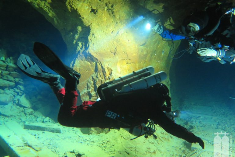 Endlich ging es am nächsten Tag los zum Tauchen. Peter Kubicka nahm uns nach einer kleinen Autofahrt direkt vor der Opalmine in Empfang. Er erklärte uns zunächst einiges zur Historie und zu einigen Sicherheitsregeln, die einzuhalten sind. Die ersten beiden Voraussetzungen haben wir uns von Zuhause mitgebracht: einen Helm und eine Stirnlampe. Mit einem leichten Grinsen im Gesicht zeigte er uns den Zugang zum Tauchplatz, den er mit Pfeilen kennzeichnete: erst einmal geht es eine gerade Strecke, ca. 500 Meter in den Berg hinein und dann noch einmal ca. 100 Höhenmeter über unregelmäßige Naturstufen abwärts. Am Tauchplatz selbst sind dann Rödeltische vorhanden. Nicht umsonst haben wir uns unsere Handwagen mitgebracht, Jedoch über die Stufen bringen uns diese auch nichts. Und auch die ebene Strecke war ungleichmäßig, sodass wir alles, also D12 und Rebis in den Berg hineintrugen. Für die Stages hat Peter seine Kubi-Rucksäcke mitgebracht. Da passen je nach Größe ein bis zwei Stages hinein.