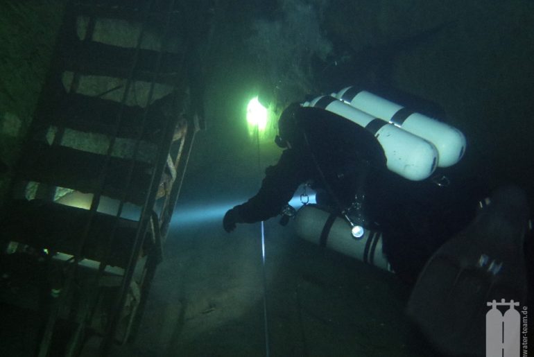 Brrr – Jozsef hatte es uns vorher mitgeteilt: Das Wasser an dem Tauchplatz ist 4° C kälter als an den anderen. Warum? Das weiß man nicht. Aber egal – 9° C sind immer noch sehr angenehm – gerade im Trockentauchanzug. Ein weiteres Phänomen ist ein Wurm, der an den anderen Plätzen nicht vorkommt. Der Tauchgang führte uns zunächst wieder entlang einer Treppe in eine Halle. Überall sind noch Lampen und Steuerungsmodule vorhanden. Sehr interessant. Wir ließen uns in der Halle bis zum Grund fallen, wobei wir noch eine Zwischendecke passierten, und tauchten langsam wieder hoch. Unterhalb der Zwischendecke ging es in einen Gang, der zu einer etwas kleineren Halle führte. Der Gang war zwar hoch, aber nicht sehr breit. Die Decke konnten wir nicht erkennen. Die Lampe reichte nicht soweit. Auf dem Rückweg tauchten wir zunächst den Gang wieder zurück, aber dann quetschten wir uns durch einen schmalen Spalt in einen weiteren Raum. Mit der Erkundung dessen und eines weiteren Raumes traten wir auch leider schon wieder den Rückweg an.