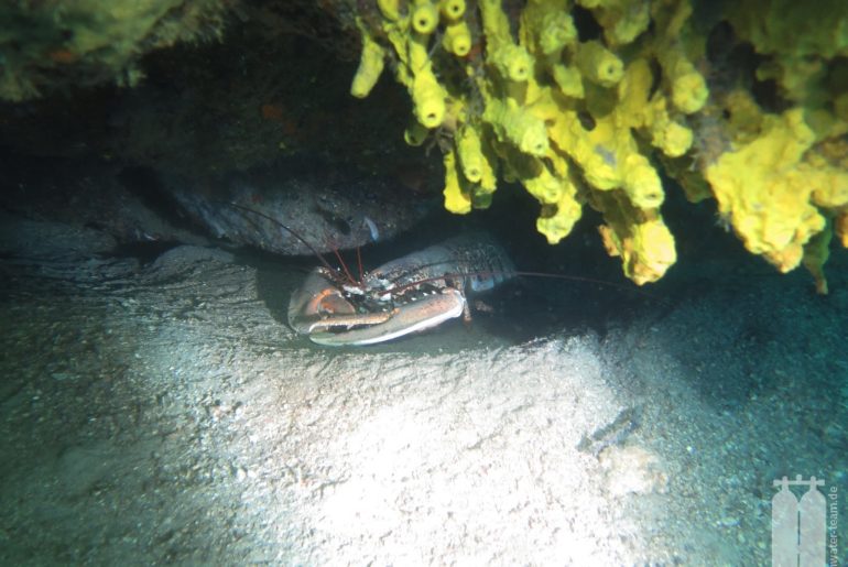 Nach ca. 45 Min. Bootstour waren wir am Tauchplatz angekommen und sprangen ins Wasser. Dieses Mal war kein weiteres Tauchboot da. Wir waren also alleine. Mit einer leichten Strömung auf dem Hinweg schwebten wir an der Steilwand vorbei. Die kleinen Spalten und Löcher bieten nicht nur schöne Formationen und Abwechslung in der Landschaft sondern auch Lebewesen einen Unterschlupf. Leider liegt hier auch viel Unrat. Bei 30 Metern Tiefe ist die Steilwand zu Ende und geht in Sandboden über. Sie erstreckt sich nicht die ganze Zeit sondern unterbricht immer wieder durch seichter abfallenden Boden. Nach einer halben Stunde kehrten wir um und tauchten zum Boot zurück. Kurz vorm Auftauchen schauten wir noch einmal am Boden der Steilwand, wo diese in Sandboden übergeht, vorbei. Instinktiv warfen wir einen Blick unter die letzte Kante und da saß er dann: ein großer, ausgewachsener Hummer.