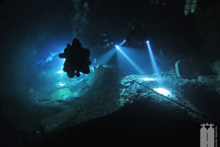 Von der Mainline bogen wir bei unserem ersten Tauchgang direkt rechts in den ersten Gang ab. Wir folgten der Line immer weiter in die Tiefe. Irgendwann, so ab 30 m wurde die Sicht auch besser, denn oben war sie schon ein bisschen staubig. Ab der besagten Tiefe wurden wir mit klarem Wasser belohnt und atemberaubenden Lichtspielen durch andere Taucher beeindruckt. Herrlich. Leider ist nur auch mal irgendwann der Rock Bottom erreicht und so mussten wir umkehren, denn wir hatten auch noch einige Minuten auf den entsprechenden Dekostufen zu verbringen. Es war ein gelungener erster Tauchgang.