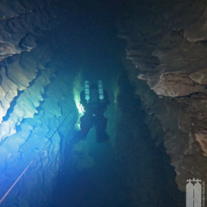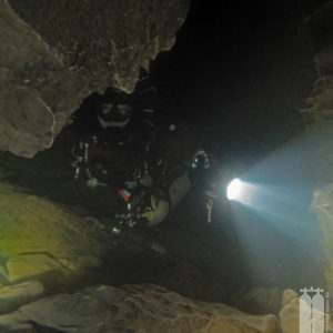 Obacht mussten wir etwas beim Eindringen in die Höhle geben, denn wenn man zu weit nach rechts am Eingang kommt, dann trägt einen die Strömung davon. Das Hineintauchen gestaltete sich aber als nicht weiter schwierig. Zunächst verlief der Tauchgang völlig unspektakulär und wir folgten der Mainline bis zum ersten T. Hier setzten wir unsere Cookies, um dann weiter in das Höhleninnere einzutauchen bzw. dieses zu penetrieren. Einige Zeit später, kurz vor Steffies Umkehrdruck, kamen wir an eine Stelle, an der statt einer Mainline eine Ankerkette gelegt war. Der Grund ist naheliegend: Mit Hilfe dieser muss man gegen die stark zunehmende Strömung ankämpfen. Hier war die Sicht glasklar und wir waren ganz enttäuscht, dass Steffies Umkehrdruck schon erreicht war. Schade. Wir konnten kaum glauben, dass wir schon zurück mussten. Aber es half alles nichts. Auf ging es gen Ausgang, aber nicht ohne einen Abstecher am T in den Unterwassersee der Schauhöhle zu machen. Und dann kamen auch noch prompt ein paar Gäste, die ihren Augen nicht trauen konnten. Haha. Das war vielleicht lustig. Die haben geguckt. Mit einer ausgelassenen Stimmung ging es danach aber endgültig Richtung Ausgang. Menno. Nun hieß es wieder aufpassen, dass wir nicht von der Strömung erfasst und mit in den Fluss gerissen werden. Das ging aber alles gut. Nach 45 Minuten tauchten wir wieder auf. Nun war noch mehr los an der Schauhöhle und die Besucher schauten ganz interessiert. Jeder stellte Fragen und einige konnten und wollten sogar Deutsch sprechen.