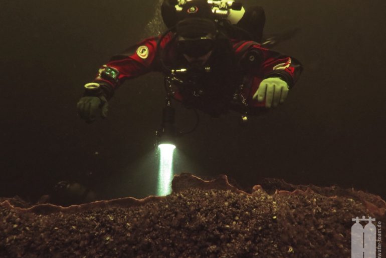 Nach einem ausführlichen, langen Frühstück (bei dem Angebot konnte man sich nicht einfach ein Brötchen zwischen die Kiemen schieben) starteten wir dann unseren zweiten Tauchtag. Zunächst statteten wir der Scuba Akademie neugierigerweise einen Besuch ab. Dort bekommt man neben Luft auch Nitrox und Helium. Aber da wir genug an Flaschen eingepackt haben, mussten wir überhaupt nicht füllen. Als wir am Tauchplatz ankamen, war es voll, allerdings kommen doch einige eher ganz früh einen Tauchgang machen und verschwinden dann gegen späten Vormittag wieder. Und so war unser spätes Erscheinen kein Problem. Die Ausrüstung war schnell zusammen gebaut und unserem dritten Tauchgang stand nichts mehr im Weg. Wir tauchten zunächst wieder zur 17 m-Plattform, um von dort aus den Leinen zu folgen. Bei 30 m brachen wir allerdings irgendwann ab, denn die Sicht wurde immer schlechter und ein Ziel war nicht zu erahnen. Das Holzboot zog uns dann noch einmal an. Wir wollten dort noch ein bisschen posen. Plötzlich war in der Ferne schemenhaft ein Fisch zu erkennen und dann tauchte ein großer Hecht mit einem Aal im Maul auf. Peter hatte den schon tags zuvor gesehen, aber nicht die Kamera in der Hand. Und dann kam noch ein Zander dazu. Sie waren etwas abseits vom Boot, aber hielten ganz still beim Fotografieren. Nach einer Weile tauchten wir noch einmal weiter in Richtung Bus, um dort auch noch ein paar Fotos zu machen. Nachdem wir noch ein bisschen bei den dort stattfindenden Kursen zuguckten, beendeten wir unseren Tauchgang nach knapp 120 Minuten.